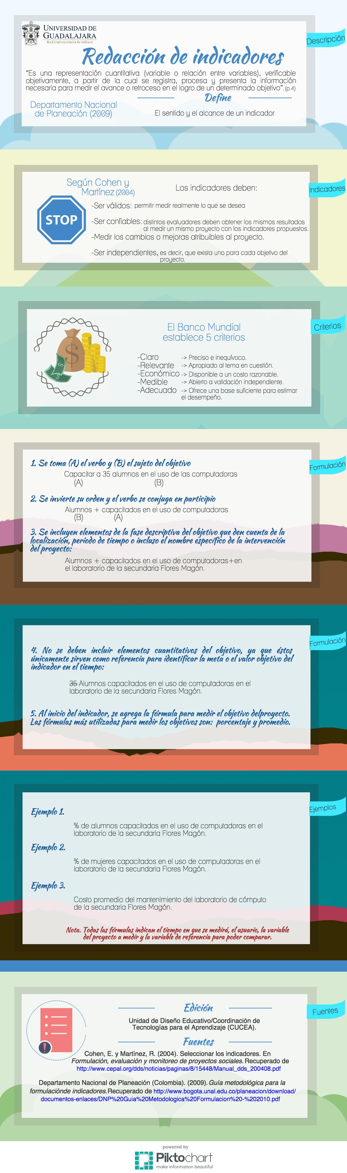 | Citación : | Unidad de Diseño Educativo (Ed.). (08 de marzo de 2015). Redacción de indicadores [Infografía] (Adaptación de contenido a cargo de M.B. Camarena Barba). Zapopan, Jalisco: CTA-CUCEA, Universidad de Guadalajara. |